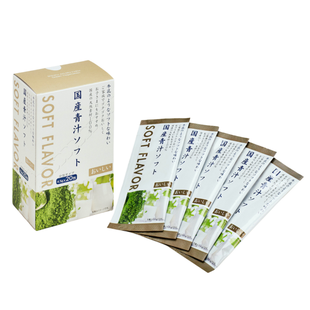 以日本國內栽培的大麥若葉、桑葉、羽衣甘藍為基底,加入北海道產大豆與甜菜糖,調配出如豆乳般柔和順口的風味。