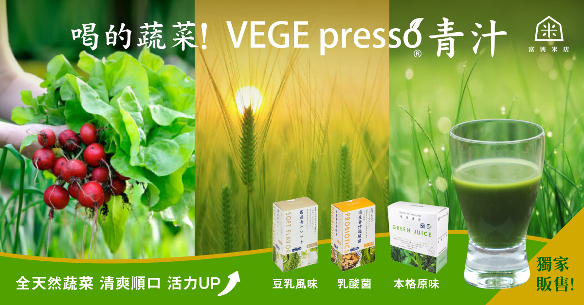 在健康意識高漲、植物性飲食受矚目的今日,VEGE presso 重新定義「日本青汁」。透過專利製程,打造 100% 植物成分、完全無添加的青汁飲品,讓忙碌生活也能輕鬆補足每日蔬菜攝取。