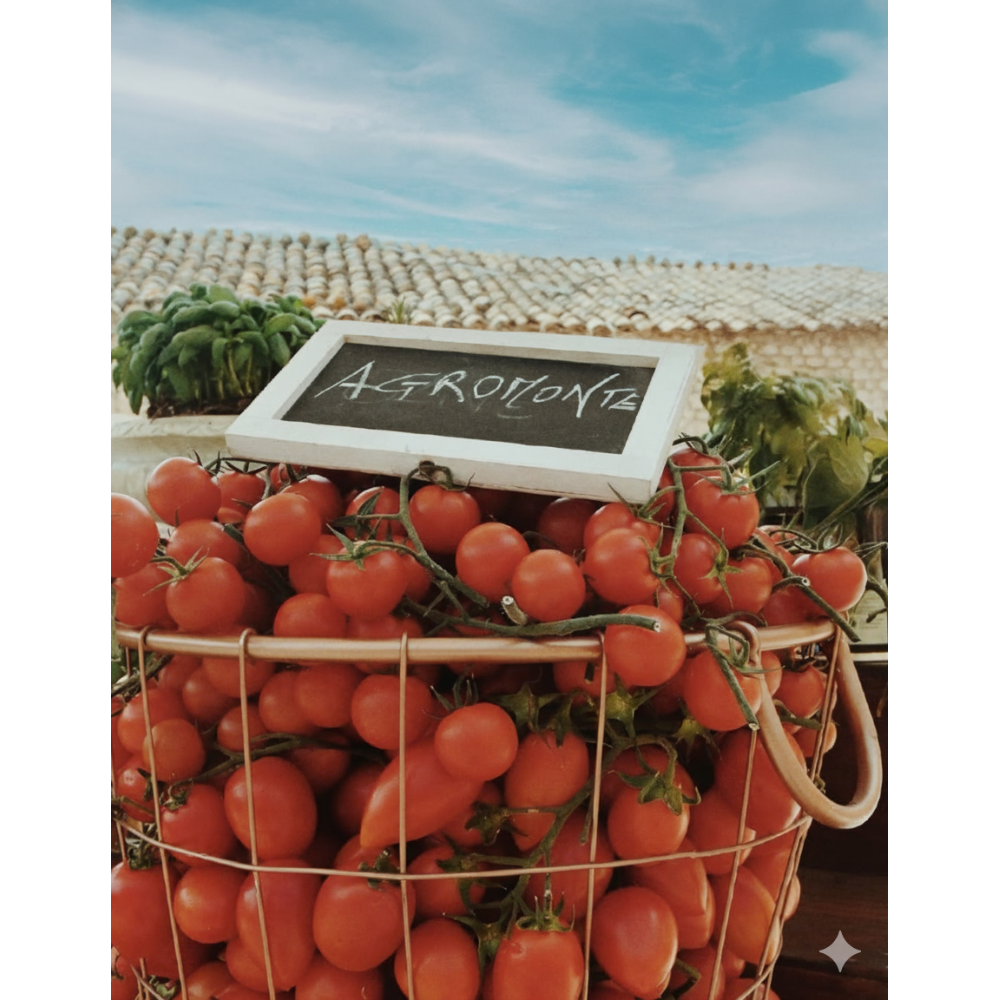 Agromonte 位於義大利西西里島的基亞拉蒙泰—古爾菲(Chiaramonte Gulfi)市鎮,坐落於日照充足、溫差大的地中海氣候區。家族自有廣袤農園,依循季節聘用25至150名員工,從溫室育苗、授粉、生長管理到人工採收,每顆番茄都經過專家每日巡視,確保風味、甜度與香氣臻至完美狀態之際,再以人工逐一採收。