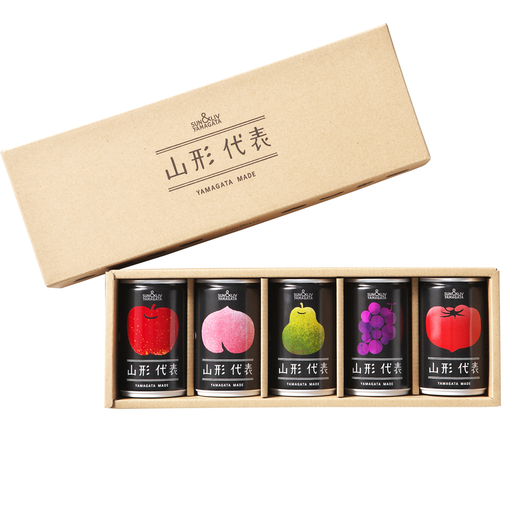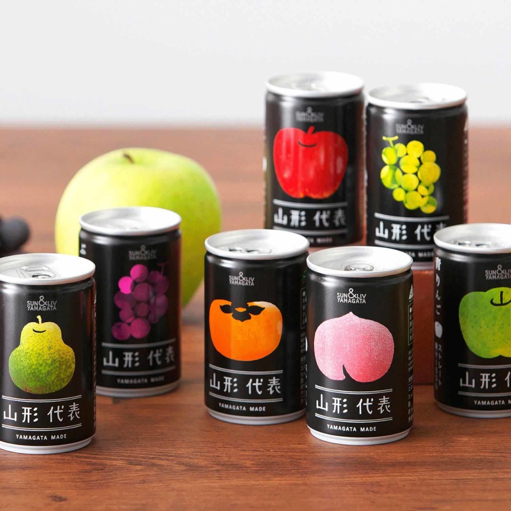 山形代表系列果汁選用當地特產的蘋果、葡萄、洋梨、水蜜桃等新鮮果物榨汁,100%原汁,不添水不加糖,且未使用化學添加物,開罐即飲,是日本各大高級食品選物店必備的天然果汁。